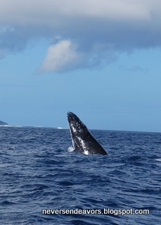 He spotted a pectoral fin in the air. A humpback whale's pectoral fins can be up to 15 feet long...so it is noticeable when they raise their fin out of the water. It was still an amazing spot...seeing one pectoral fin in the ocean of blue. As we raced over, we hoped he would stay around. Luckily, he continued to splash and hold his fin or tail in the air as we approached. He decided to increase his aerobics routine.The humpback began body lunging. This is when they propel the front half of their body out of the water...like a submarine surfacing. And with their big dark bodies and torpedo shape, they really do look like a sub surfacing. He lunged several times. It was impressive. But it did not stop there. A few minutes later, he breached. Breaching is when they thrust their whole body up and out of the water. I can not imagine how much power is required to thrust that much mass up and out of the water. AND then they sometimes twist which wraps their pectoral fins around their belly. Just impressive!